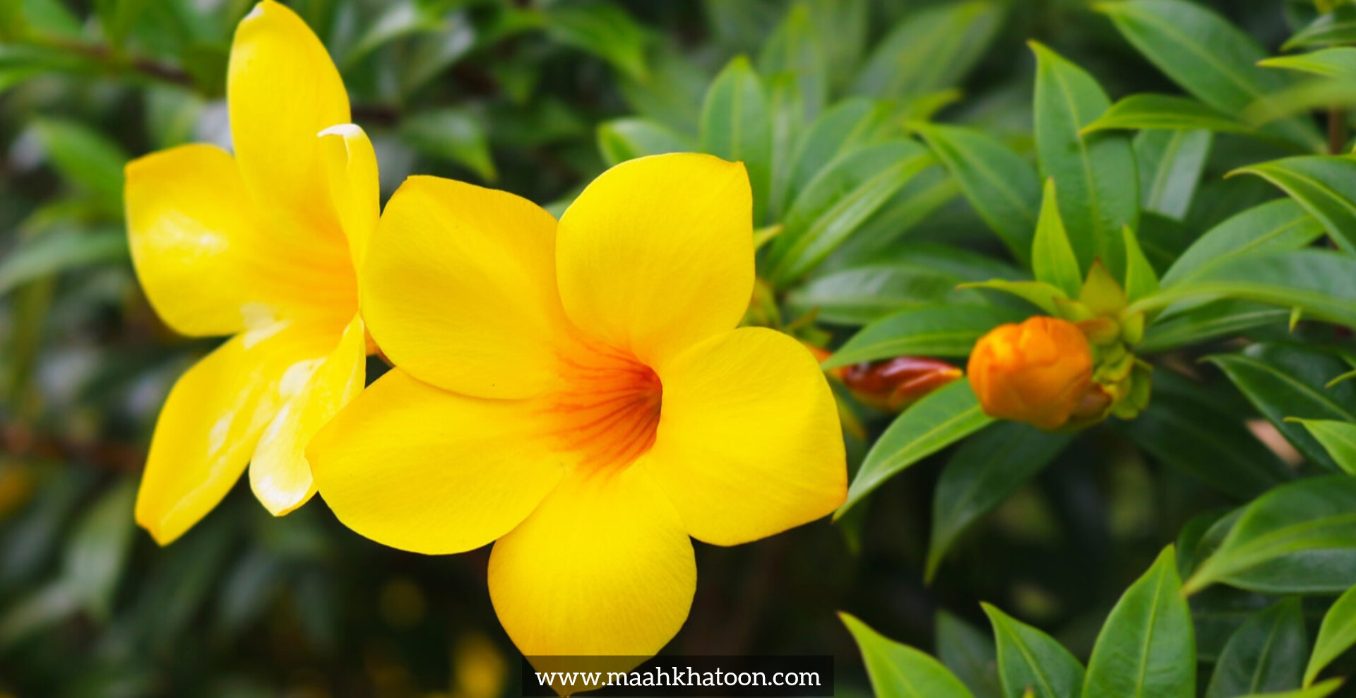 گیاه آلاماندا گلهای زرد رنگ و معطر دارد که به شکل شیپور هستند و ۶سانتیمتر قطر و ۹ سانتیمتر طول دارند و زمان گلدهی آن در تمامی طول تابستان تا اولین سرما است. البته ناگفته نماند که برخی از نمونههای این گیاه نیز گلهایی با رنگهای سفید، کرم، صورتی و نارنجی دارند. برگها نیز چرمین به طول ۶ سانتیمتر، عرض ۳ سانتیمتر و به رنگ سبز روشن است و حاشیههایی مواج دارد. دمبرگها نیز بسیار کوتاه و در حد ۵-۱ میلیمتر هستند. از آنجایی که در طی یک فصل رشد ساقه این گیاه میتواند ۳-۱ متر رشد کرده گل دهد و همچنین با توجه به اینکه شیوه تکثیر آسانی نیز دارد، گاهی آلاماندا را به شکل گیاهی یکساله پرورش میدهند.