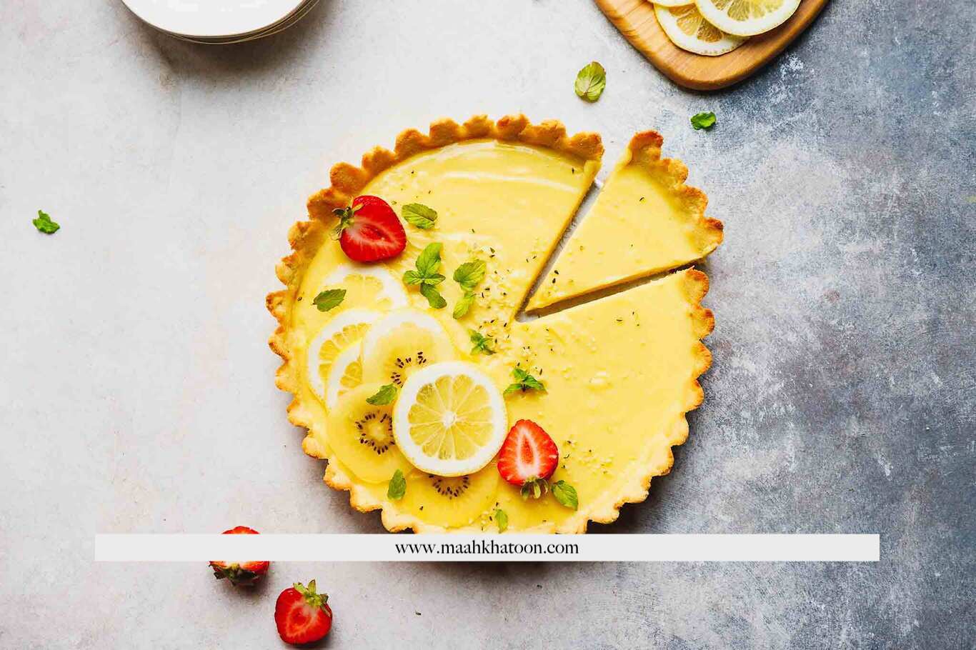 در یک کاسه تخم مرغ ها، خاک قند، پوست لیمو ترش و آب لیمو ترش را به همراه خامه می ریزیم و همۀ مواد را کمی مخلوط می کنیم. مخلوط لیموئی را روی خمیر می ریزیم.