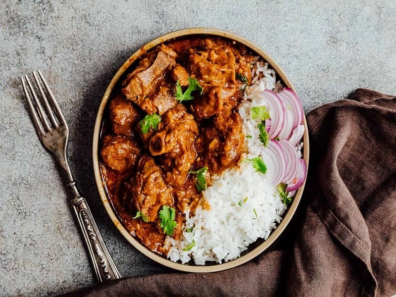 وقتی عصاره گوشت را در سس گوجه فرنگی خالی کردید، داخل قابلمه گوشت را به اندازه ۱ یا ۲ قاشق غذاخوری روغن حیوانی (یا روغن مایع) اضافه کنید. تکه‌های گوشت داخل قابلمه را با روغن روی حرارت متوسط کمی تفت دهید تا سرخ و طلایی شوند. سپس شنبلیله، فلفل چیلی و بقیه زنجبیل را به مواد اضافه کنید.