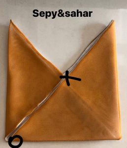بعد از دوخته شدن نقاطی که مشخص شده بود حالا داخل کیف رو به سمت رو برگردانید و از نقطه o به دو طرف نقطه های x حدود ۹ سانت علامت بزنید.