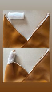 بعد از برگردوندن مستطیل مون به سمت روی پارچه، دور تا دور مستطیل اطو میشه و قسمتی که باز گذاشته بودیم و دوخته نشده بود، برای برگردوندن کارمون، با نخ سوزن و یا چرخ میدوزیم و میبندیمش.